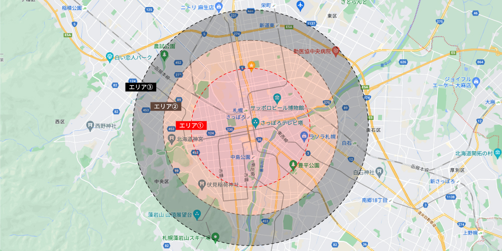 札幌市中央区を中心に、出張可能エリアと交通費は下記の通りです 出張可能エリア・交通費 エリア① 中央区及び中心部から3km以内 無料 エリア② 札幌市中心部から3km~4.5km ¥1,000 エリア③ 札幌市中心部から4.5km~6km ¥2,000 ※2022年1月現在、清田区・厚別区・手稲区・南区への出張はしておりません。 ※詳しくは直接オペレーターよりご案内させて頂きますので、お気軽にお問合せ下さい。